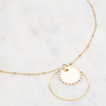 Collier réglable type sautoir composé d'un pendant graphique rond ajouré et d'un anneau.