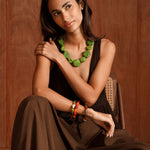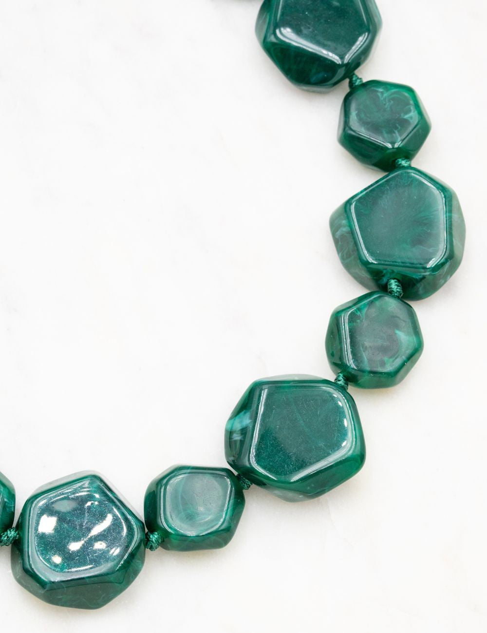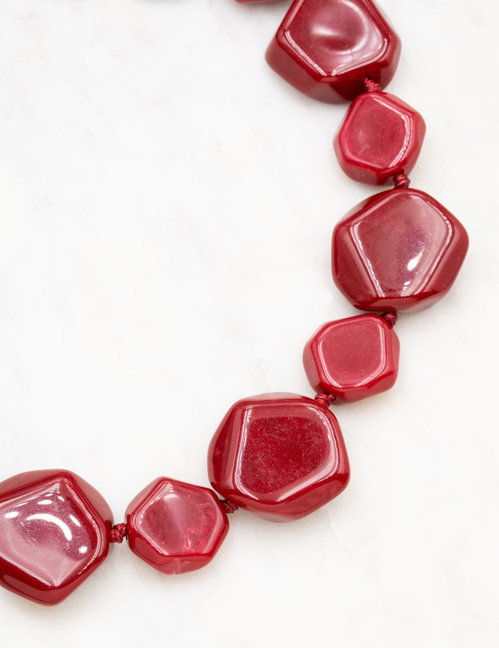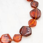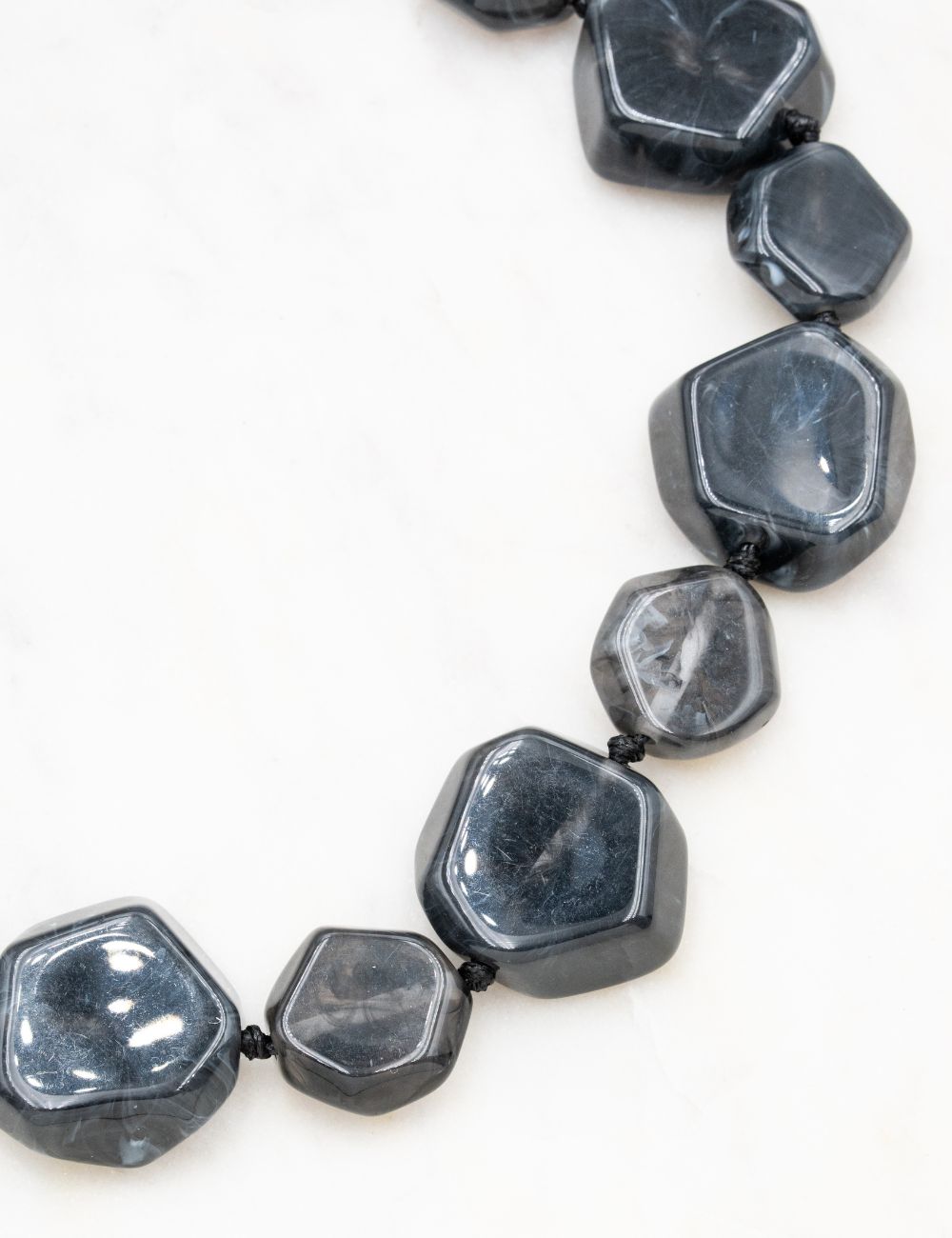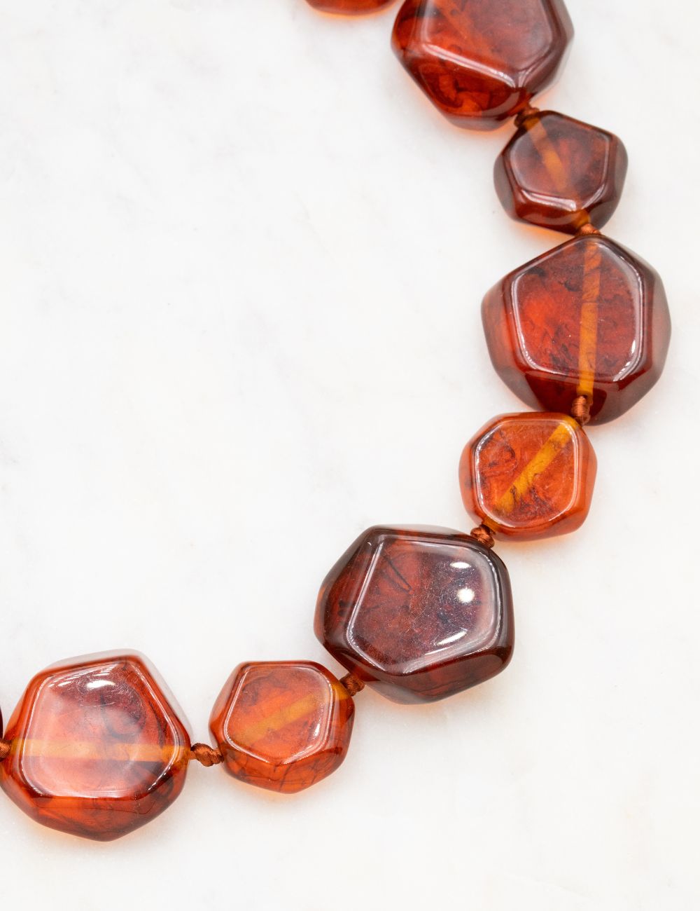 Collier sur cordon réglable composé d'un enfilage de perles en résine acétate colorée.