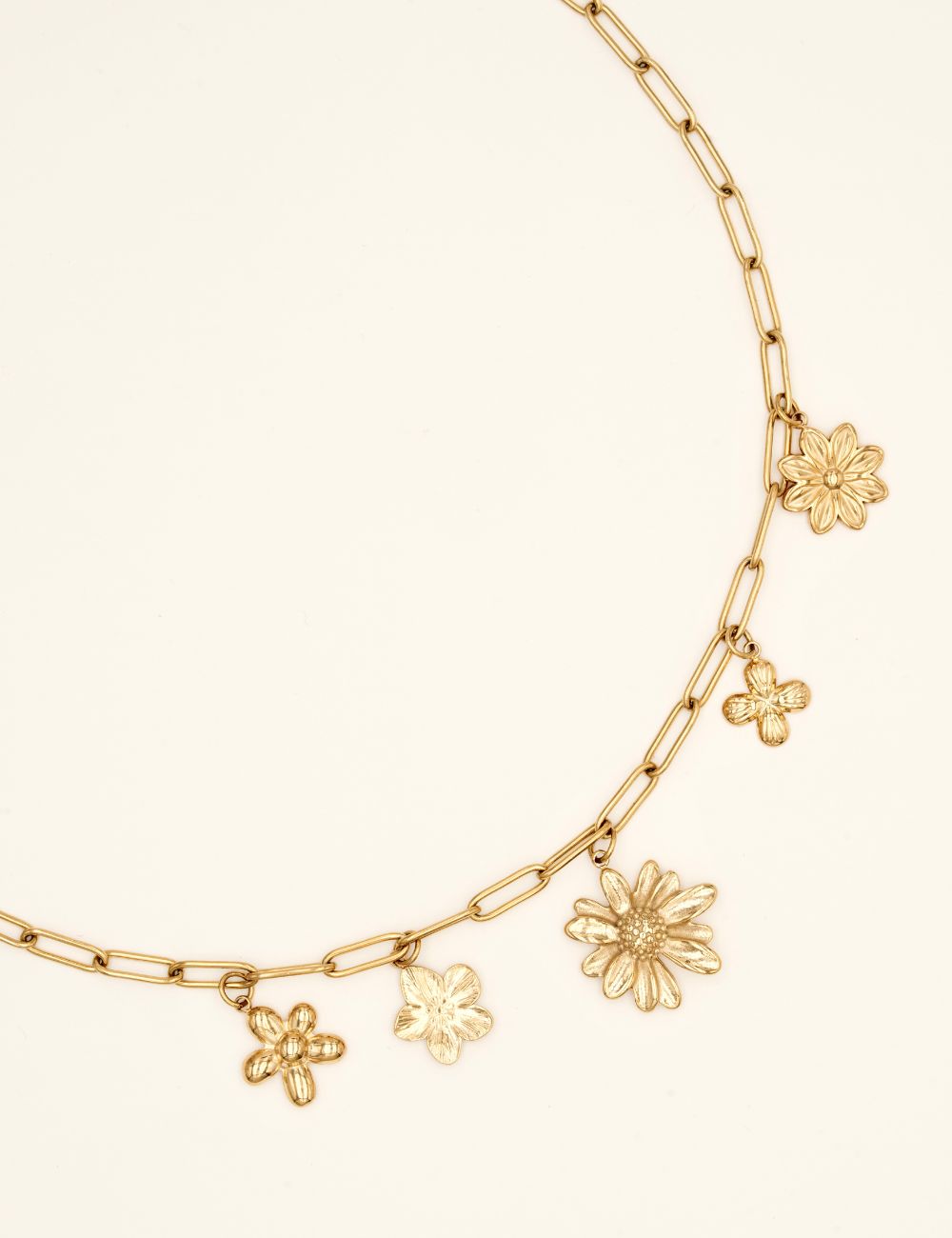Collier réglable en maille sur chaine composé de cinq pendentifs forme fleur.