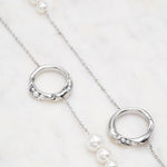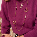 Collier type sautoir en maille composé de pièces graphiques texturées ornées de perles nacrées.