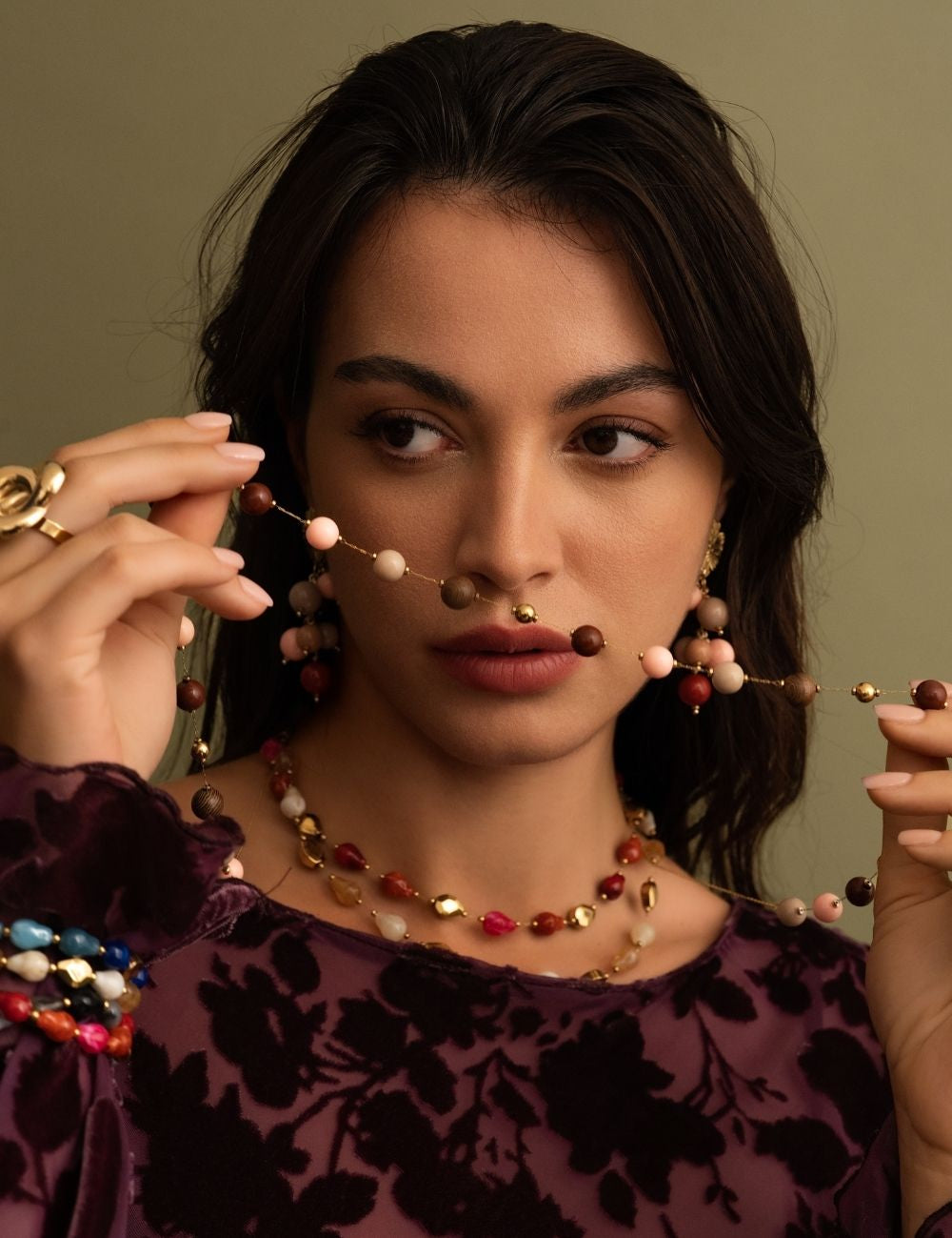Collier réglable type sautoir sur chaîne composé de perles en résine colorée, de perles en bois et de perles en acier.