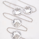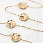 Collier type sautoir sur chaine avec un jeu de pièces graphiques texturées et ajourées. Fermoir mousqueton.