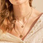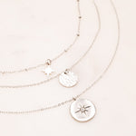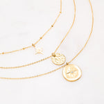 Collier réglable sur chaine 3 rangs composé d'une pièce étoilée, d'une pièce martelée et d'une pampille étoilé ornée d'un petit strass zirconium.