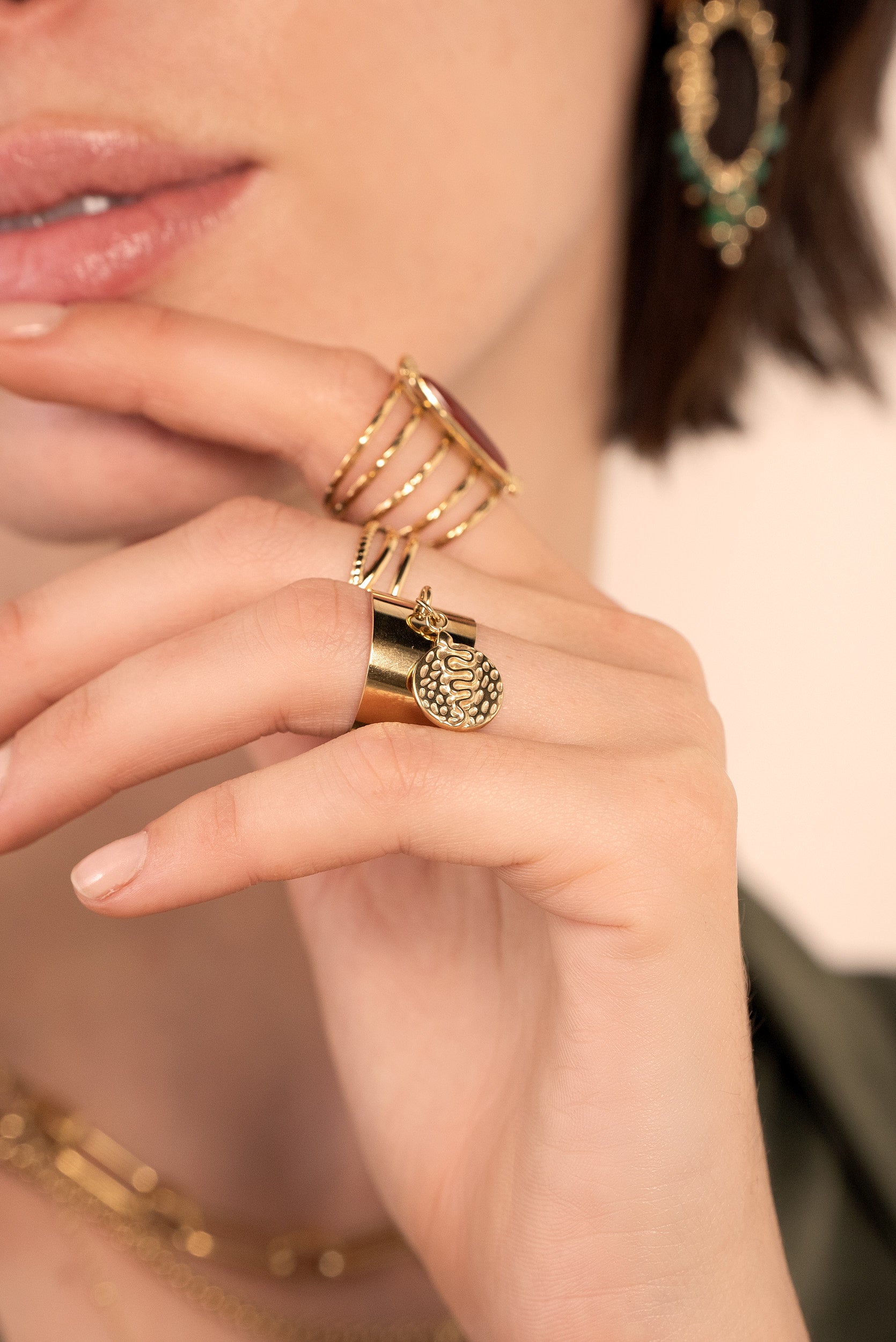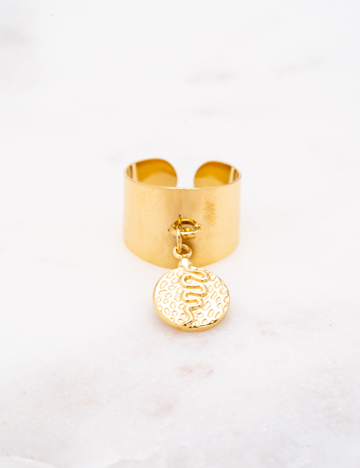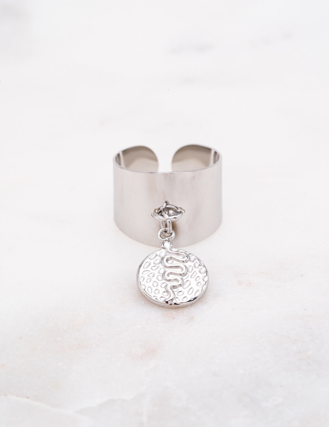 Bague ajustable composée d'une pampille au motif de serpent gravé.